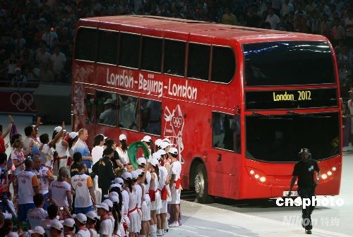 8月24日晚,北京奧運(yùn)會(huì)閉幕式在奧林匹克公園內(nèi)的國(guó)家體育場(chǎng)舉行,下屆奧運(yùn)會(huì)主辦城市倫敦市上演“倫敦8分鐘”演出,一輛倫敦標(biāo)志性的雙層紅色巴士駛?cè)搿傍B(niǎo)巢”體育場(chǎng)。中新社發(fā) 任晨鳴 攝