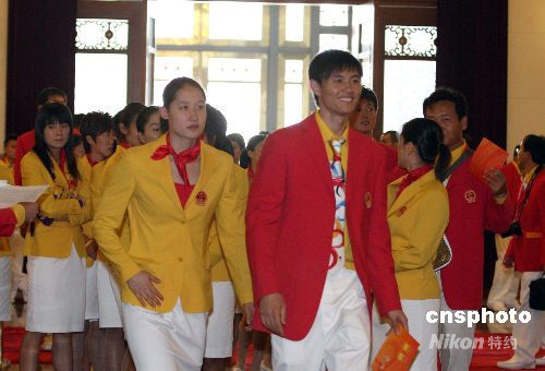 8月26日,2008年北京奧運(yùn)會中國體育代表團(tuán)總結(jié)大會在北京人民大會堂金色大廳舉行。仲滿、劉子歌出席北京奧運(yùn)會中國體育代表團(tuán)總結(jié)大會。中新社發(fā) 廖文靜 攝
