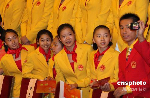 8月26日,2008年北京奧運(yùn)會(huì)中國(guó)體育代表團(tuán)總結(jié)大會(huì)在北京人民大會(huì)堂金色大廳舉行。女子體操運(yùn)動(dòng)員參加北京奧運(yùn)會(huì)中國(guó)體育代表團(tuán)總結(jié)大會(huì)。 中新社發(fā) 廖文靜 攝