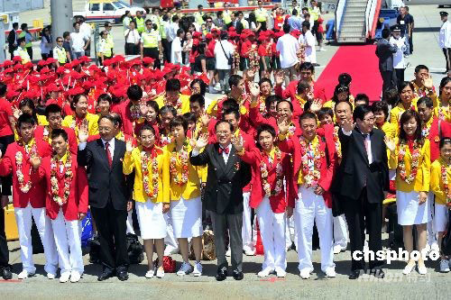 八月二十九日上午十一時(shí),中國(guó)國(guó)家奧運(yùn)金牌運(yùn)動(dòng)員代表團(tuán)的六十三名成員乘坐飛機(jī)抵達(dá)香港機(jī)場(chǎng),特區(qū)行政長(zhǎng)官曾蔭權(quán)等官員到場(chǎng)迎接。 中新社發(fā) 譚達(dá)明 攝