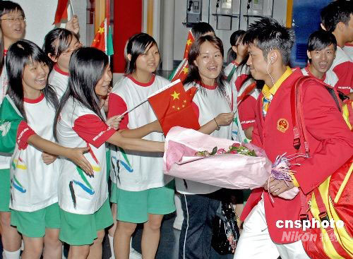 八月三十一日傍晚,北京奧運內(nèi)地金牌運動員代表團(tuán)一行九十三人抵達(dá)澳門,開始為期三天的訪問。中新社發(fā) 澳門新聞局 攝