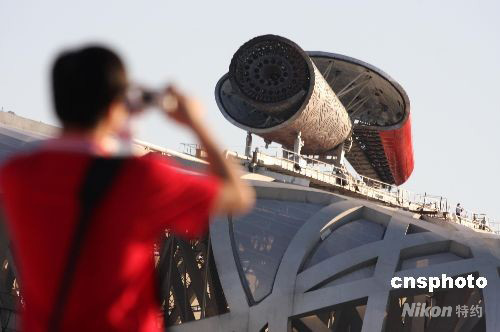 2008年8月31日,工作人員在“鳥巢”上方檢修火炬塔。9月6日,北京殘奧會(huì)主火炬將在國家體育場“鳥巢”再一次被點(diǎn)燃。 中新社發(fā) 吳芒子 攝