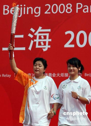 九月一日,北京殘奧會(huì)火炬接力“時(shí)代風(fēng)采線”第三站傳遞活動(dòng),在上海松江新城大學(xué)園區(qū)進(jìn)行,共有六十名火炬手參加。其中,殘疾人員10名,其余為助殘、幫殘的先進(jìn)代表和基層殘疾人事業(yè)工作者。圖為上海首枚殘奧會(huì)金牌獲得者趙繼紅(左)擔(dān)任第一棒火炬手。 中新社發(fā) 湯彥俊 攝