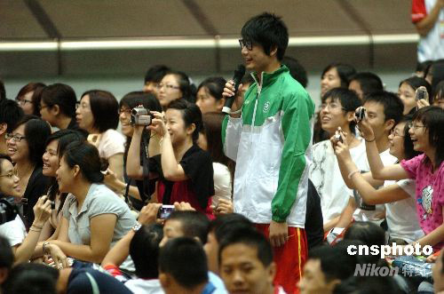 訪問澳門的奧運(yùn)金牌運(yùn)動(dòng)員代表九月一日上午與澳門青少年真情對(duì)話。澳門五十所學(xué)校二千五百名學(xué)生出席對(duì)話會(huì)。圖為澳門學(xué)生踴躍提問。中新社發(fā) 畢永光 攝