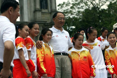 九月一日上午,北京奧運(yùn)內(nèi)地金牌運(yùn)動(dòng)員代表團(tuán)在澳門展開第二日訪問行程,代表團(tuán)團(tuán)長劉鵬與奧運(yùn)女子體操團(tuán)體金牌選手們?cè)诎拈T著名景點(diǎn)大三巴前留影。中新社發(fā) 洪少葵 攝