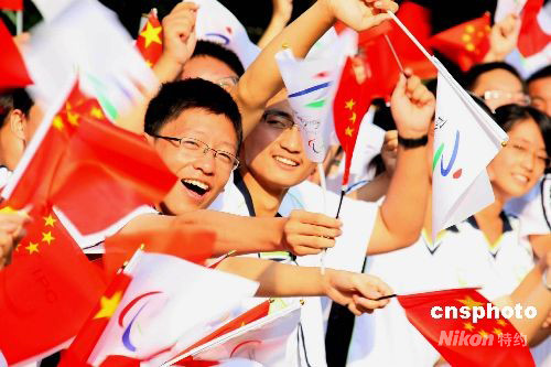 九月二日上午,北京殘奧會火炬?zhèn)鬟f接力到南京,受到民眾的熱烈歡迎。中新社發(fā) 牛莉 攝