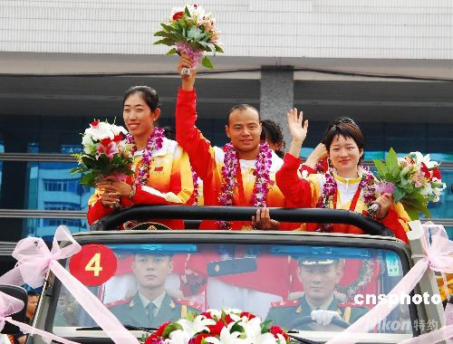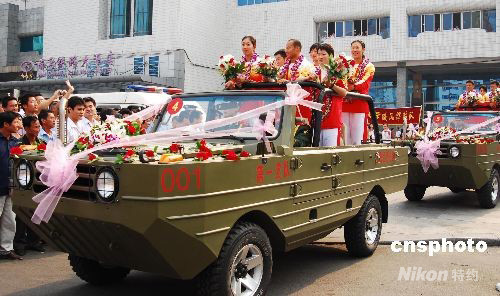 圖為北京奧運皮劃艇冠軍楊文軍(中)、跆拳道冠軍吳靜鈺(右)、女子賽艇四人雙槳冠軍金紫薇乘坐水陸兩棲車向家鄉(xiāng)人民致敬。