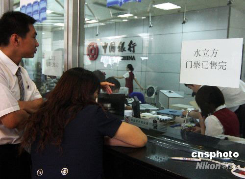 9月3日,觀眾在中國(guó)銀行北京王府井支行銷售網(wǎng)點(diǎn)排隊(duì)購(gòu)買殘奧會(huì)門票。據(jù)悉,從2日開始,又有一定數(shù)量的殘奧會(huì)比賽門票向公眾投放。“水立方”和“鳥巢”的殘奧會(huì)門票依然最火爆。但因?yàn)橥斗艛?shù)量不同,“水立方”門票只十分鐘就全部售光,中行王府井支行柜臺(tái)已經(jīng)張貼“水立方售完”告示。中新社發(fā) 吳芒子 攝