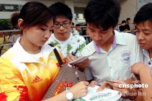 圖為被譽為中國最美奧運冠軍的何雯娜為眾多大學(xué)生“粉絲”簽名。 中新社發(fā) 劉可耕 攝