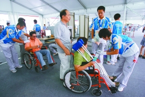 《京華時報》記者在距離“鳥巢”相對較遠的西側(cè)安檢大棚看到,每一個安檢大棚門和地面之間,都鋪設(shè)了灰色的地毯,并且地毯呈向下的坡形,讓坐著輪椅的觀眾出入非常輕松。