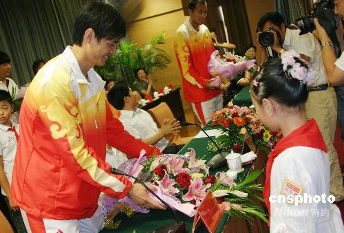 9月5日,北京奧運(yùn)會(huì)佩劍冠軍仲滿、沙灘排球運(yùn)動(dòng)員吳鵬根回到家鄉(xiāng)江蘇海安。當(dāng)?shù)嘏e行歡迎儀式迎接載譽(yù)回鄉(xiāng)的奧運(yùn)健兒,共同分享北京奧運(yùn)奪金的喜悅。中新社發(fā) 徐瑞平 攝