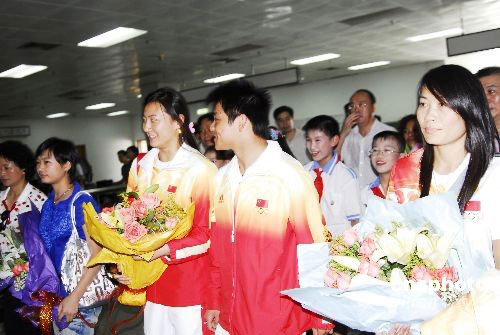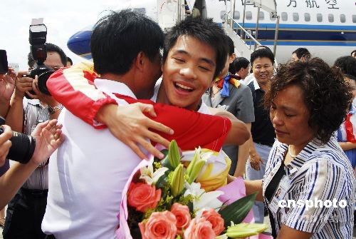 9月4日,剛參加完第29屆奧運(yùn)會廣東省總結(jié)表彰會的湛江籍奧運(yùn)冠軍何沖等飛抵湛江,受到湛江市政府和父老鄉(xiāng)親的熱烈歡迎。當(dāng)日上午,何沖母!拷械谒男W(xué)、赤坎區(qū)業(yè)余體育學(xué)師生代表和他的親朋好友,到湛江機(jī)場迎接何沖的歸來。同期抵湛江的還有湛江籍北京奧運(yùn)季軍、國家花樣游泳隊(duì)隊(duì)員劉鷗,國家女足運(yùn)動員謝彩霞以及湛江籍運(yùn)動健兒張小冬和上屆奧運(yùn)冠軍勞麗詩等,他們于當(dāng)天下午參加了湛江市的慶功表彰大會,湛江市授予何沖湛江市勞動模范稱號;湛江市總工會授予劉鷗和謝彩霞“五一勞動獎?wù)隆狈Q號;共青團(tuán)湛江市委授予劉鷗“湛江市模范共青團(tuán)員”稱號,謝彩霞“湛江市模范青年崗位能手”稱號;湛江市婦聯(lián)授予劉鷗和謝彩霞“三八紅旗手”稱號。中新社發(fā) 李滿青 攝