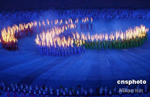 9月6日20時(shí),北京2008年殘奧會(huì)開(kāi)幕式在國(guó)家體育場(chǎng)“鳥(niǎo)巢”舉行,中華人民共和國(guó)主席胡錦濤,國(guó)際殘奧委會(huì)主席克雷文先生等出席。開(kāi)幕式上,卡通玩偶用手中燃放的焰火組成北京殘奧會(huì)會(huì)徽?qǐng)D案。 中新社發(fā) 盛佳鵬 攝