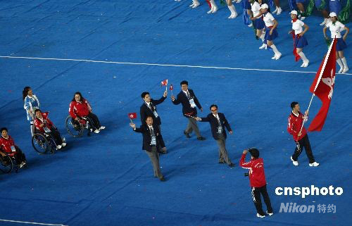 9月6日20時,北京2008年殘奧會開幕式在國家體育場“鳥巢”舉行,圖為中國香港代表團入場 。 中新社發(fā) 盛佳鵬 攝