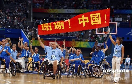 9月7日,北京殘奧會(huì)輪椅籃球比賽中,瑞典隊(duì)在比賽結(jié)束時(shí)打出了“你好,北京!”、“謝謝!中國!”的標(biāo)語。中新社發(fā) 杜洋 攝