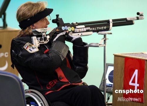 9月7日,在北京射擊館舉行了殘奧會射擊R2級女子10米氣步槍立射-SH1項(xiàng)目的決賽。德國選手曼努埃拉·施默蒙德獲得銀牌,成績?yōu)?90.2環(huán)。中新社發(fā) 宋吉河 攝
