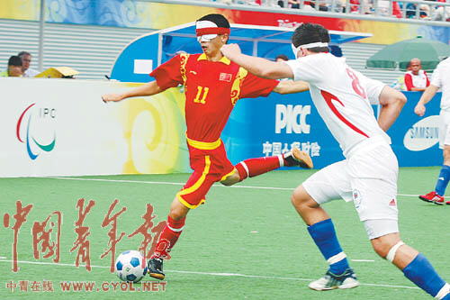 在這短短兩年時(shí)間里,中國(guó)盲人足球隊(duì)從無(wú)到有。那些根本無(wú)法看到腳下皮球的隊(duì)員們,對(duì)足球和生活的熱愛(ài)是他們每天兩三個(gè)小時(shí)重復(fù)那套固定帶球技術(shù)的最大動(dòng)力。和人們印象中丑陋的中國(guó)足球截然相反,無(wú)論是前鋒還是后衛(wèi),他們帶球行進(jìn)如行云流水,只要球在腳下,就有足夠的技術(shù)和智慧去完成對(duì)皮球的控制——本場(chǎng)比賽獨(dú)中兩元的王亞峰更是明星中的明星,他在前場(chǎng)毫不停頓的突破讓英國(guó)隊(duì)的盯人和區(qū)域兩套防守陣容形同虛設(shè)。