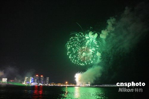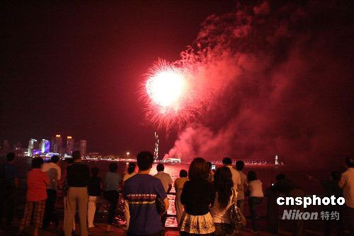 9月7日晚,殘奧會帆船賽啟動儀式在青島奧林匹克帆船中心主題公園舉行,眾多市民和游客在五四廣場及音樂廣場觀看焰火。當(dāng)晚,青島街頭燈火輝煌、流光溢彩。中新社發(fā) 尤中原 攝