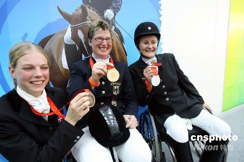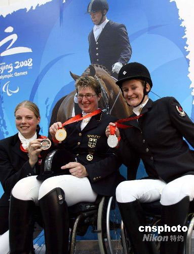 九月八日上午,德國選手布麗塔·納佩爾(中)在香港奪得北京殘奧會(huì)馬術(shù)比賽個(gè)人錦標(biāo)賽科目級別Ⅱ冠軍,摘取殘奧會(huì)馬術(shù)比賽首金,加拿大選手勞倫·巴威克(右)獲得銀牌,丹麥選手卡羅琳·尼爾森獲銅牌。中新社發(fā) 洪少葵 攝