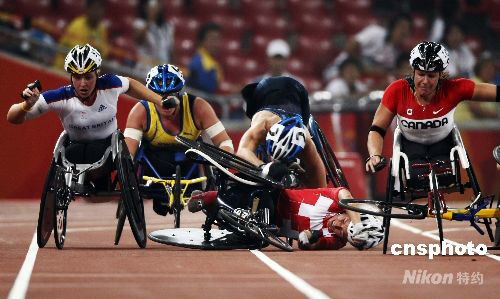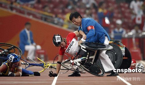 9月8日晚,北京殘奧會田徑比賽女子5000米T54級決賽在北京國家體育場“鳥巢”進行,選手們在比賽中相撞倒地。 中新社發(fā) 盛佳鵬 攝