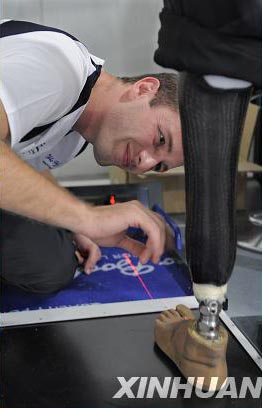 圖為9月8日,維修人員通過(guò)激光校準(zhǔn)儀在為一名俄羅斯運(yùn)動(dòng)員的“左腳”進(jìn)行檢測(cè)。新華社記者 陳曉偉攝