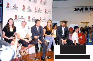 菲爾普斯(左二)到歐米茄展區(qū)參加活動(dòng),隨衛(wèi)隊(duì)員在一旁警衛(wèi)