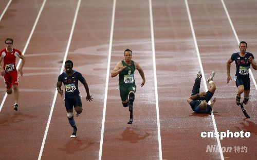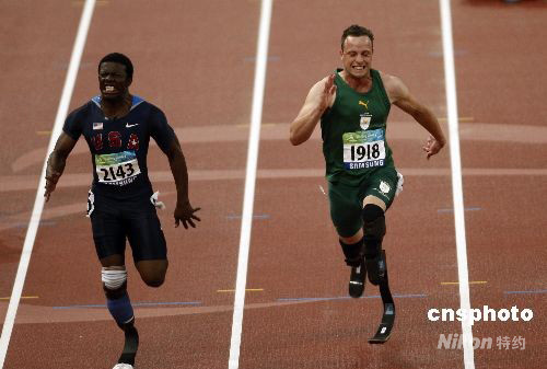 9月9日,北京殘奧會男子100米-T44決賽中,被稱為“刀鋒戰(zhàn)士”的南非選手皮斯特瑞斯以11秒17的成績摘得金牌。 中新社發(fā) 杜洋 攝