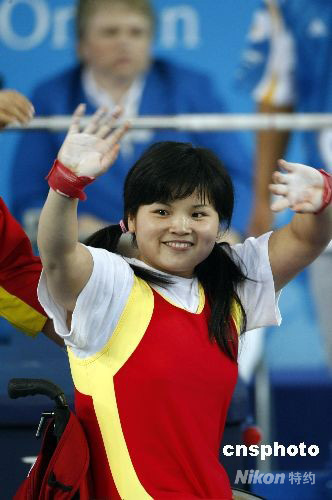 9月9日,北京殘奧會(huì)舉重比賽在北京航空航天大學(xué)體育館展開(kāi)首日的爭(zhēng)奪,在女子44公斤級(jí)的比賽中,中國(guó)選手肖翠娟以100公斤奪得北京殘奧會(huì)中國(guó)舉重隊(duì)第一枚金牌。 中新社發(fā) 盛佳鵬 攝