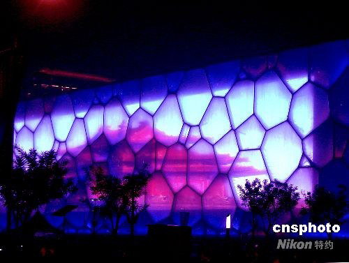 在北京殘奧會(huì)舉辦時(shí)節(jié),國(guó)家游泳中心“水立方”的墻面上投影出著名的故宮角樓圖像,更顯示迷人的夢(mèng)幻色彩。 中新社發(fā) 賈國(guó)榮 攝