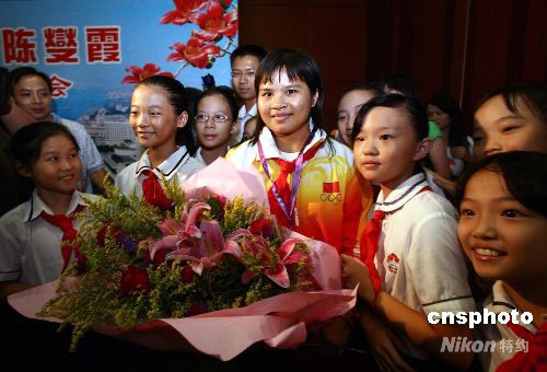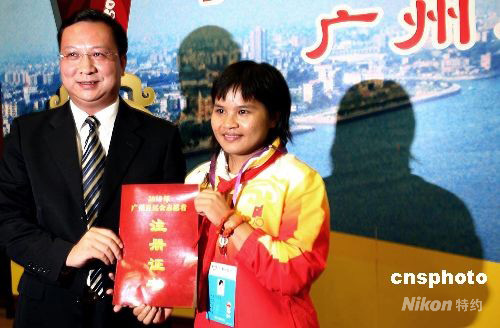 2008年9月10下午,共青團(tuán)廣州市委舉辦的奧運(yùn)冠軍陳燮霞廣州座談會(huì)上在廣州白云國際會(huì)議中心舉行,廣州市十佳少先隊(duì)員代表和廣州奧運(yùn)志愿者代表與在2008北京奧運(yùn)會(huì)上奪得首金的舉重冠軍陳燮霞“零距離”面對面,傾聽她的奧運(yùn)冠軍故事。在這個(gè)座談會(huì)上,陳燮霞正式注冊成為0000001號(hào)廣州亞運(yùn)會(huì)志愿者,并向全市青年倡議“創(chuàng)建文明城市 支持廣州亞運(yùn)會(huì)”。 中新社發(fā) 夏世焱 攝