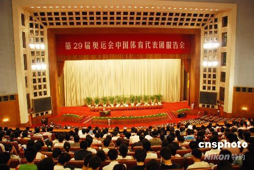 9月11日,由中共中央宣傳部、中央直屬機關(guān)工委、中央國家機關(guān)工委、教育部、國家體育總局和北京市委聯(lián)合舉辦的第29屆奧運會中國體育代表團報告會在人民大會堂隆重舉行。中新社發(fā) 楊慧峰 攝