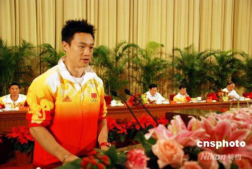 圖:體操個(gè)人全能冠軍楊威在報(bào)告會上發(fā)言