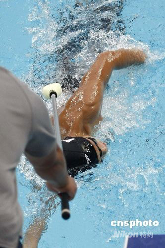 教練在泳池邊利用提示棒敲擊運動員背部“指導”選手沖刺。