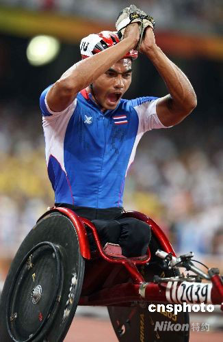 9月11日晚,北京殘奧會田徑比賽繼續(xù)在奧林匹克公園內的國家體育場“鳥巢”舉行,在男子5000米-T54級決賽中,泰國選手巴越·沃霍倫一路領先,并在最后時刻頂住各路選手的反撲,在這個一直被歐美強手統(tǒng)治的項目中奪得冠軍。中新社發(fā) 任晨鳴 攝
