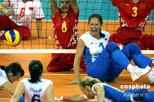 北京殘奧會坐式排球女子半決賽9月12日在北京農(nóng)業(yè)大學(xué)體育館舉行,中國女隊以3比0橫掃斯洛文尼亞闖進決賽,將與美國女隊爭奪冠軍。中新社發(fā) 任晨鳴 攝