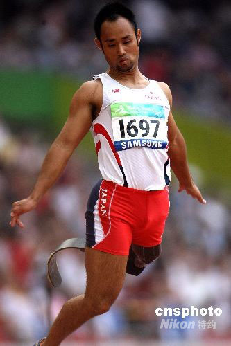 北京殘奧會(huì)田徑比賽9月16日繼續(xù)在北京奧林匹克公園內(nèi)的國(guó)家體育場(chǎng)--鳥巢舉行,F(xiàn)42級(jí)別的日本選手山本篤在男子跳遠(yuǎn)-F42/44級(jí)別決賽中以5.84米、989分的成績(jī)獲得亞軍。中新社發(fā) 任晨鳴 攝