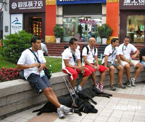 2008年9月16日下午,幾名參加北京殘奧會(huì)的外國運(yùn)動(dòng)員來到王府井游覽購物,忠實(shí)的導(dǎo)盲犬一直尾隨在其中的盲人運(yùn)動(dòng)員左右。中新社發(fā) 玉龍 攝