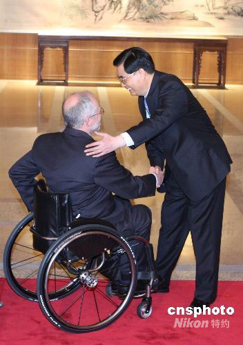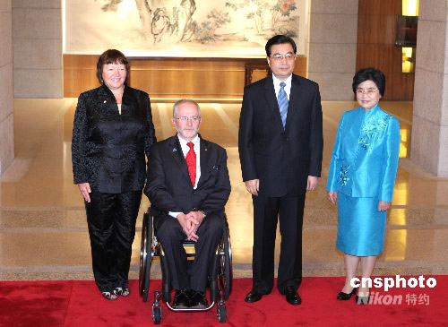 9月17日,中國國家主席胡錦濤與夫人劉永清在北京釣魚臺國賓館芳菲苑舉行宴會歡迎出席北京殘奧會閉幕式的國際貴賓。圖為胡錦濤與夫人迎接殘奧委會主席克雷文夫婦。中新社發(fā) 廖文靜 攝