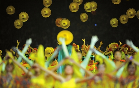 “歡慶篇章”是整臺(tái)晚會(huì)“寄給未來(lái)的一封信”的壓軸戲,而“草帽舞”是“歡慶”中的高潮部分、晚會(huì)的亮點(diǎn)之一。昨晚草帽舞華麗登場(chǎng)時(shí),成都的姑娘們從舞臺(tái)的左臺(tái)口向舞臺(tái)的右底角走“斜線一字”,動(dòng)作整齊,節(jié)奏分明,邊行進(jìn)邊傳遞草帽,她們的隊(duì)列沉穩(wěn)舒緩,時(shí)圓時(shí)方,變化萬(wàn)千。到達(dá)鳥(niǎo)巢中間時(shí),草帽突然像金色的花朵,從演員手中快速飛出,在空中彼此飛舞,宛如向日葵花簇簇綻放,蔚為壯觀。而在草帽舞隊(duì)的四周,還有兩千多人輔以奔放灑脫的舞蹈表演。此時(shí)鳥(niǎo)巢內(nèi)已是掌聲雷動(dòng),歡呼陣陣。整個(gè)節(jié)目傳遞的是青春、是快樂(lè),是少女的激情與奔放,是自由與陽(yáng)光,是未來(lái)的希望,表演服飾也以紅黃為主調(diào),大紅艷麗,大黃成熟,直奔?xì)g慶主題。成都的姑娘們退場(chǎng)后激動(dòng)地說(shuō),她們的自信和當(dāng)晚的演出成功,離不開(kāi)奧組委領(lǐng)導(dǎo)的關(guān)心支持。據(jù)悉,這批專業(yè)演員全部由成都市文化藝術(shù)學(xué)校的專業(yè)舞蹈學(xué)生、演員和舞蹈教師組成。(周帥)