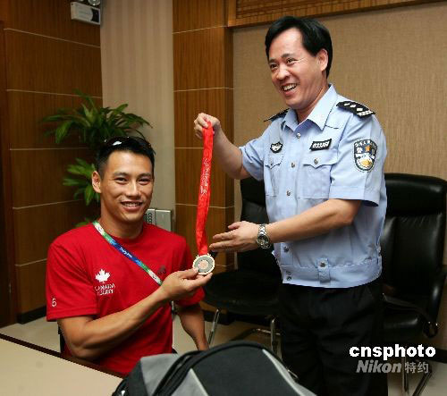 北京公交民警將獎牌交到了加拿大運(yùn)動員杰瑞德手中。