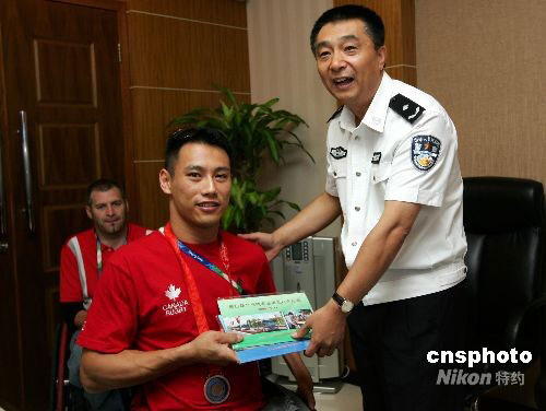 9月18日,一枚失而復(fù)得的北京殘奧會獎牌由北京公交民警交還到了加拿大運(yùn)動員杰瑞德手中。9月17日晚,加拿大運(yùn)動員杰瑞德在乘坐出租車時不慎將自己的雙肩包遺忘在車上,公交民警接警后,在線索非常有限的條件下,只用了四個小時,就將背包找回,里面有一枚寶貴的殘奧會橄欖球銅牌。中新社發(fā) 富田 攝