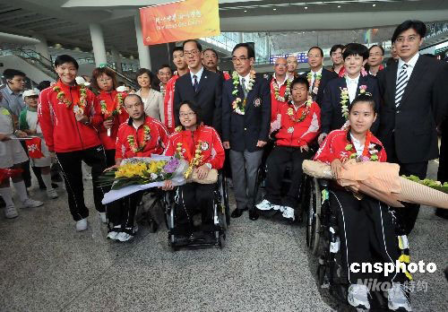 九月十八日,北京殘疾人奧運(yùn)會(huì)中國香港代表團(tuán)凱旋返港。香港民政事務(wù)局局長曾德成前往迎接,并與代表團(tuán)團(tuán)長伍澤連及運(yùn)動(dòng)員步出機(jī)場。中新社發(fā) 鄧慶樂 攝