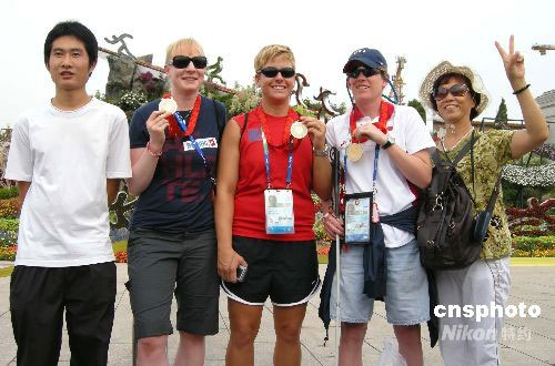 2008年9月18日,幾位獲得北京殘奧會金牌的美國盲人運動員來到北京天安門廣場游覽,吸引了眾多游客的目光,游人們竟相與他們合影留念。中新社發(fā) 玉龍 攝