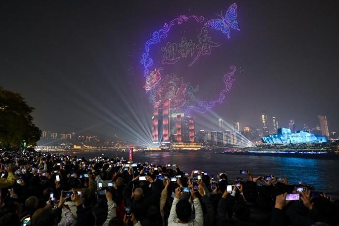 (新春見(jiàn)聞)重慶:萬(wàn)架無(wú)人機(jī)點(diǎn)亮除夕夜 繪就“賽博年味”
