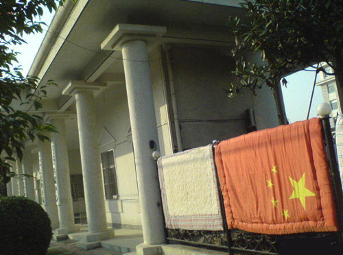 圖:國(guó)旗竟被做成被套曬在檢察院門口