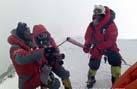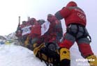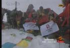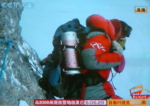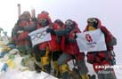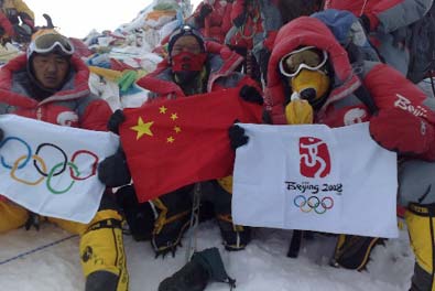 北京奧運(yùn)圣火成功今天上午9時許登上珠峰,登山隊員們在峰頂進(jìn)行了火炬接力,接力活動結(jié)束后,隊員們在世界之巔展示熊熊燃燒的祥云火炬以及中國國旗、奧運(yùn)五環(huán)旗和北京奧運(yùn)會會徽旗。