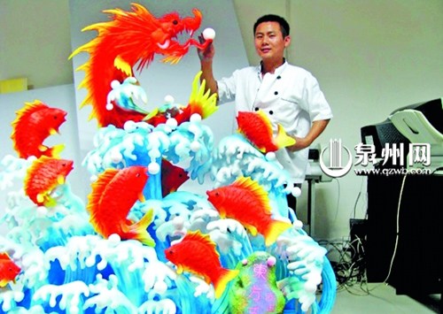 “飛天迎賓”、“鯉魚(yú)化龍”“東方醒獅”、“渡海觀音”等我(泉州)市各縣(市、區(qū))一些群眾熟悉的城市標(biāo)志,它們多為石頭、瓷、銅器等硬物雕刻而成。然而,在石獅某酒店中,“80后”的食雕師朱愛(ài)明,則用各種食品或泡沫雕成這些標(biāo)志,成為宴席上的亮點(diǎn)。