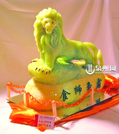 據(jù)朱愛(ài)明介紹,在作出雕刻城市標(biāo)志決定后,他便找機(jī)會(huì)對(duì)每個(gè)市標(biāo)進(jìn)行實(shí)地觀察并拍照,然后取材!耙?yàn)樵煨、圖案等的不同,不同的市標(biāo)必須用不同的食品來(lái)表現(xiàn)”,他說(shuō),比如石獅的市標(biāo),獅子頭尾高低位置相差較大,這就要求材質(zhì)必須是實(shí)心的,而且要雕出70cm高的作品,顯然很難從天然的瓜果蔬菜中找到,于是,他就選擇了石花膏。