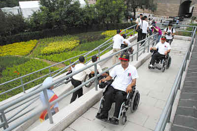 北京殘奧會的舉辦,對無障礙設(shè)施建設(shè)提出了更高的要求。景區(qū)為幫助殘疾人實(shí)現(xiàn)自主“登長城、做好漢”的愿望,新建了2部無障礙升降平臺、180米無障礙登城坡道,并對盲道、廁所進(jìn)行了改造,使殘疾游客從下車到登上長城都可以暢行無阻。目前,八達(dá)嶺無障礙設(shè)施已基本涵蓋景區(qū)所有旅游服務(wù)場所。