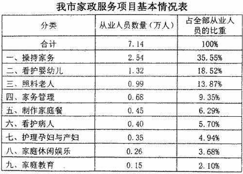 家庭服務(wù)業(yè)是以家庭為服務(wù)對象,以家庭各種事務(wù)為服務(wù)內(nèi)容的第三產(chǎn)業(yè),主要包括家庭服務(wù)、維修服務(wù)、社區(qū)導(dǎo)購、房屋租售、人才招聘、法律服務(wù)、生活百事等七大類服務(wù)內(nèi)容,涉及千家萬戶。目前,沈陽有從事該行業(yè)的各類家政服務(wù)企業(yè)558個,現(xiàn)有家政服務(wù)從業(yè)人員約7.14萬人,而社會對家政服務(wù)人員的需求則達(dá)到11萬人。家庭服務(wù)業(yè)成了當(dāng)前和今后一個時期促進(jìn)就業(yè)的一條重要渠道。